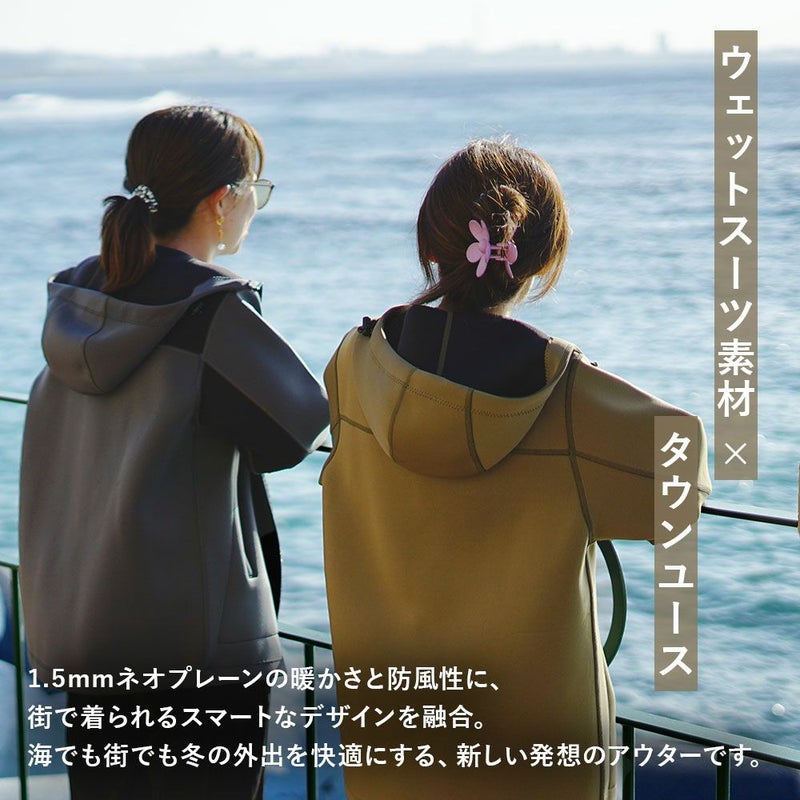 ウェットスーツ素材のジャケット型ボートコート。デザイン性を重視し、ダボっとしすぎないシルエットとサイズ感にこだわりました。