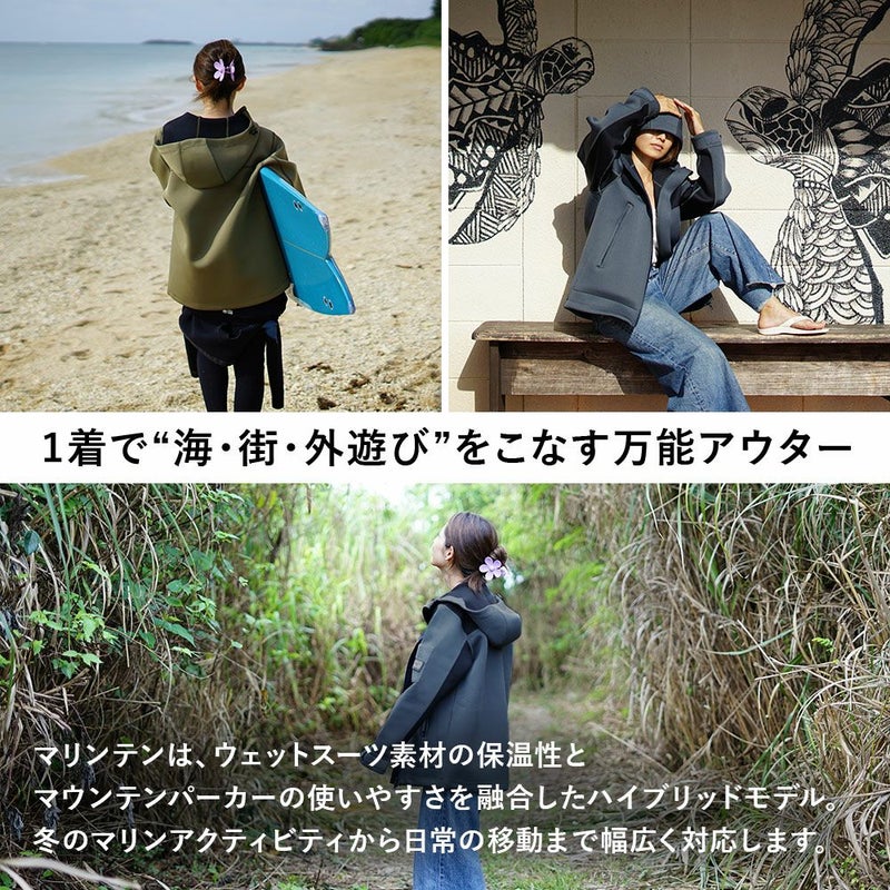 海でも街でも使える、ウェットスーツ素材の新発想アウター「マリンテン」。1.5mmネオプレーンの暖かさと防風性に、マウンテンパーカーの使いやすさを融合したハイブリッドモデルです。