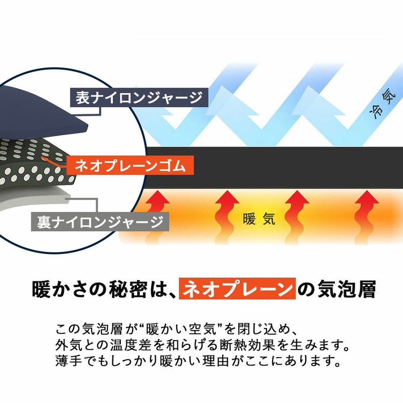 ウェットスーツにも使われる1.5mmネオプレーン素材を採用。冷たい風を通しにくく、体温を逃しにくい構造で、海辺でも街中でも安定した暖かさをキープします。雨や水しぶきにも強く、秋冬のアウトドアに最適です。