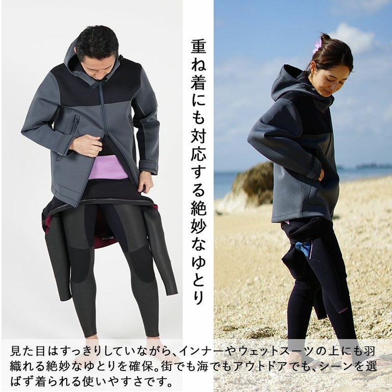 ダイビング、サーフィン、シュノーケリング、ヨット、ジェットスキー、SUP、ウェイクボードなどに最適。陸上や船上での防寒・防風ウェア(ボートコート)として活躍します。ウェットスーツやラッシュガード、水着・素肌の上から羽織っても快適です。