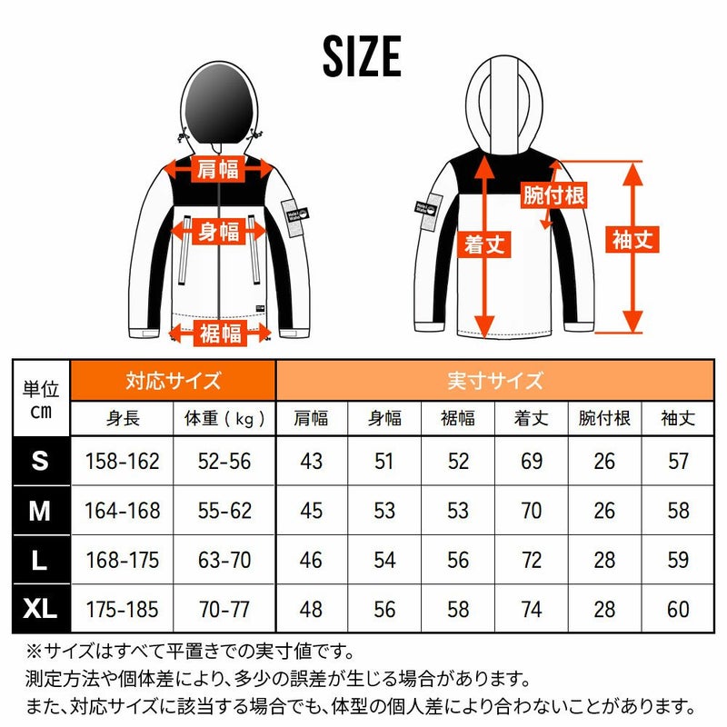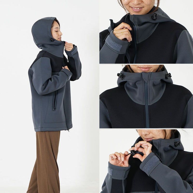 メインのダブルジップとポケットにYKKの止水ファスナーを採用。雨や波しぶきの侵入を抑えつつ、袖口ベルクロ・裾ドローコード・立体フードなど、天候に合わせて細かく調整できる機能を備えています。