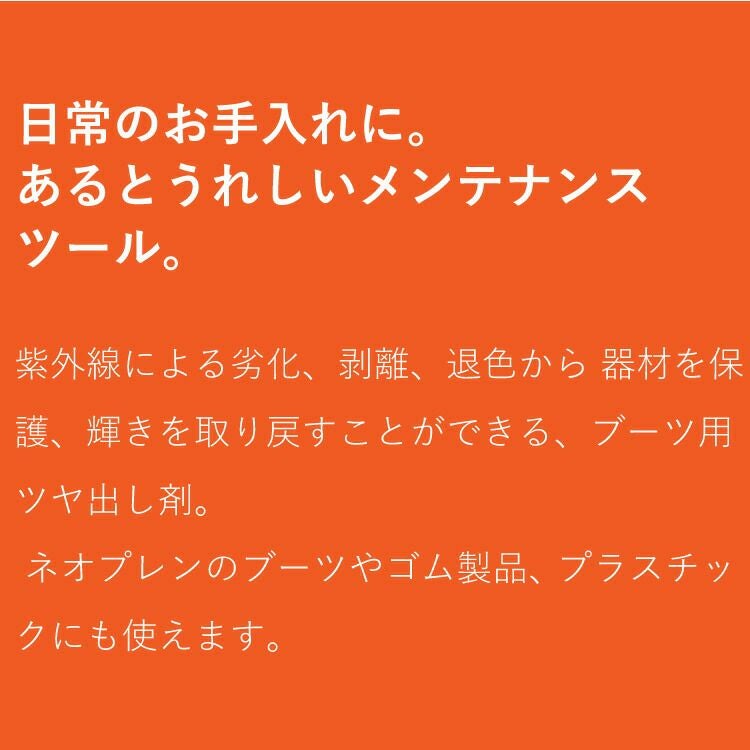商品について 紫外線による劣化、剥離、退色から 器材を保護、輝きを取り戻すことができる、保護・ツヤ出し剤。ネオプレンのブーツやゴム製品、プラスチックにも使えます。