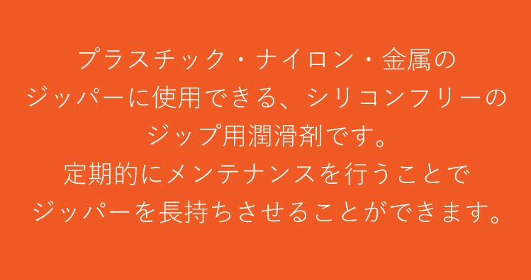 プラスチック・ナイロン・金属のジッパーに使用できる、シリコンフリーのジップ用潤滑剤です。 定期的にメンテナンスを行うことでジッパーを長持ちさせることができます。 また、長期保管の前にメンテナンスを行えば、次のシーズンも快適にお使用できるため、日々のメンテナンスを行いましょう。 |